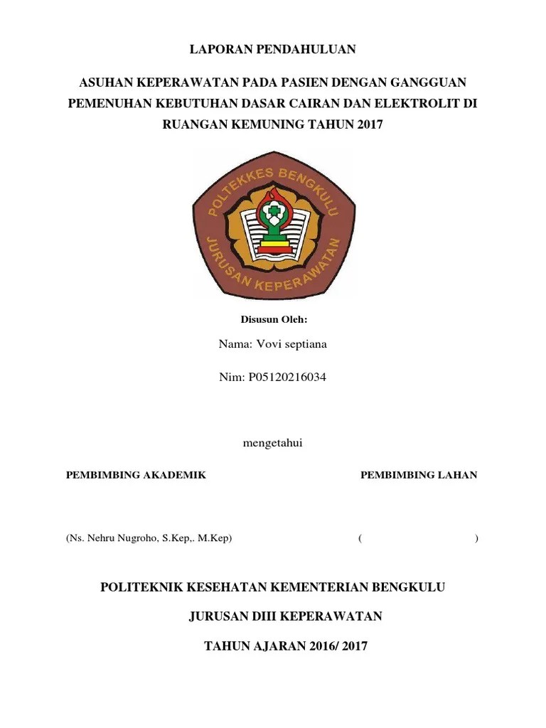 Laporan pendahuluan keperawatan dasar kebutuhan cairan dan elektrolit disusun oleh ilma anugrah herlianti e.0105.20. Laporan pendahuluan kebutuhan cairan dan elektrolit 1.1 pendahuluan agar dapat mempertahankan kesehatan dan kehidupannya, manusia membutuhkan cairan dan . Lp kebutuhan cairan dan elektrolit. Laporan pendahuluan gangguan cairan dan elektrolit pada intranatal care di ruang ponex rsud kota salatiga oleh : Lp kebutuhan cairan dan elektrolit.